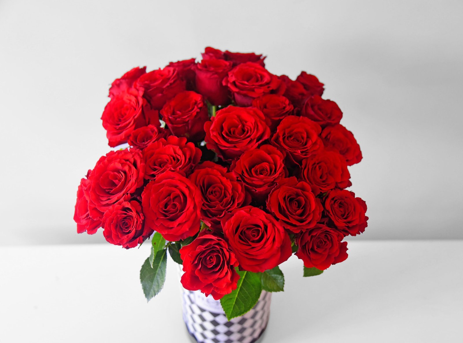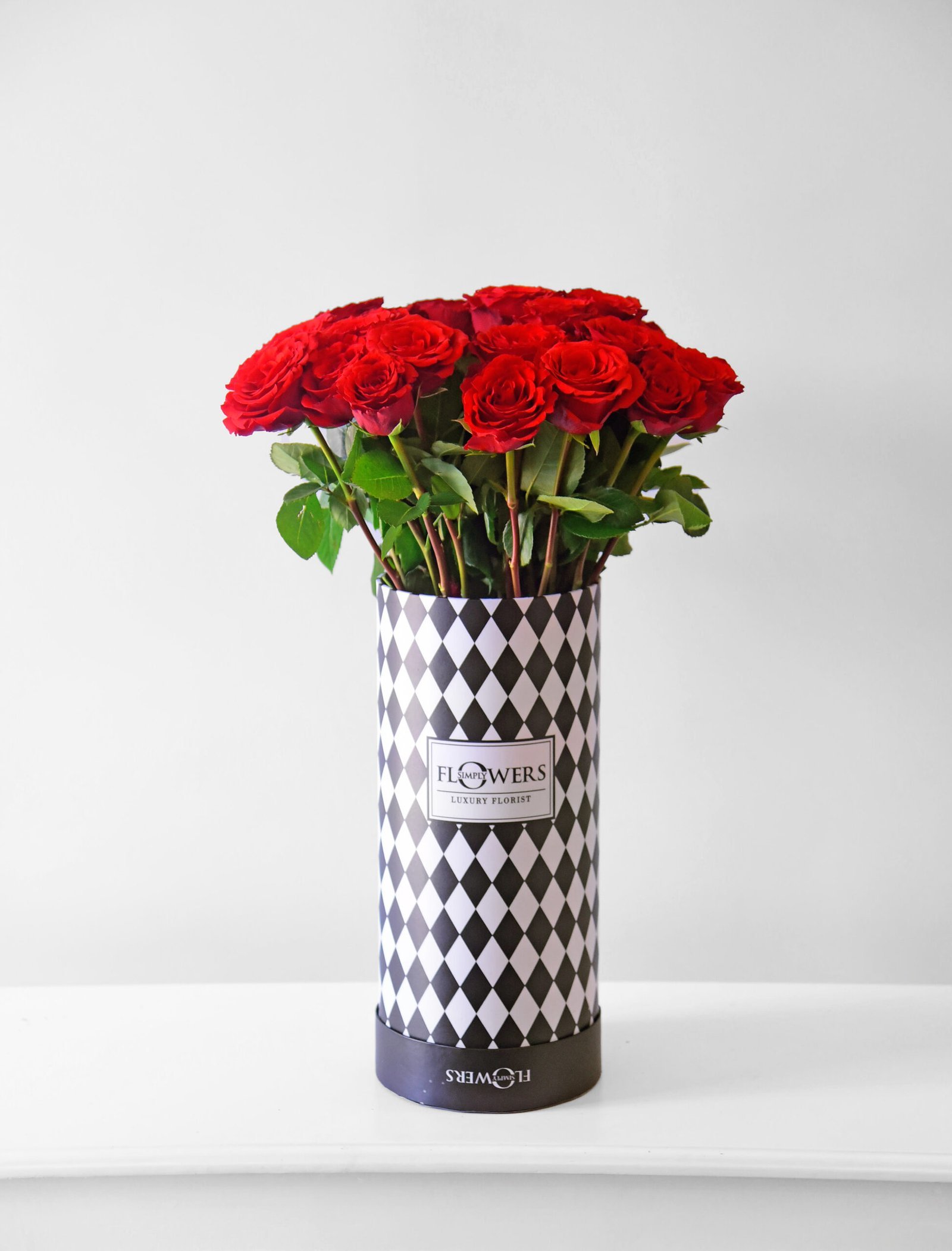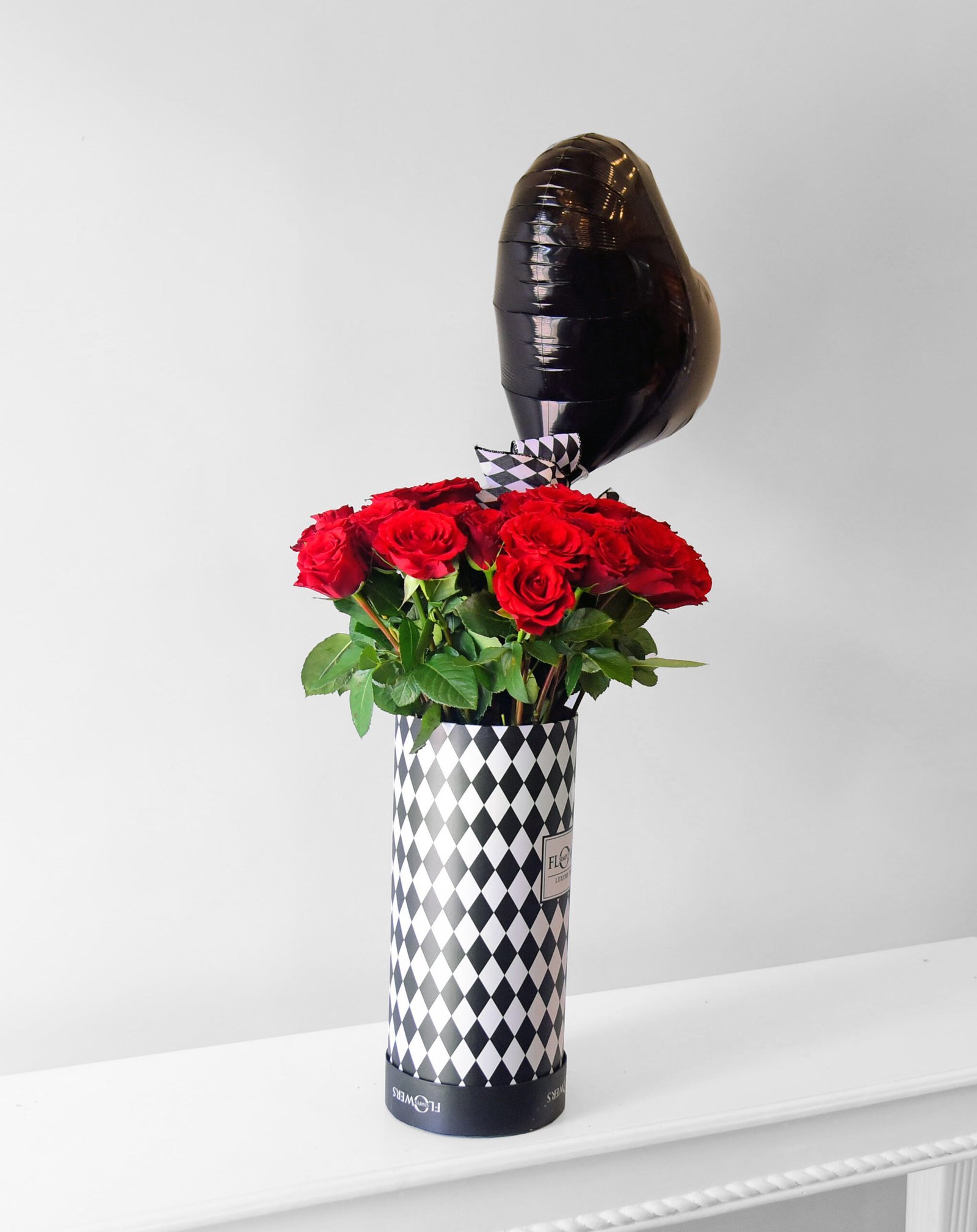 30 red roses in our signature white logo diamante print hat box with a complimentary balloon.