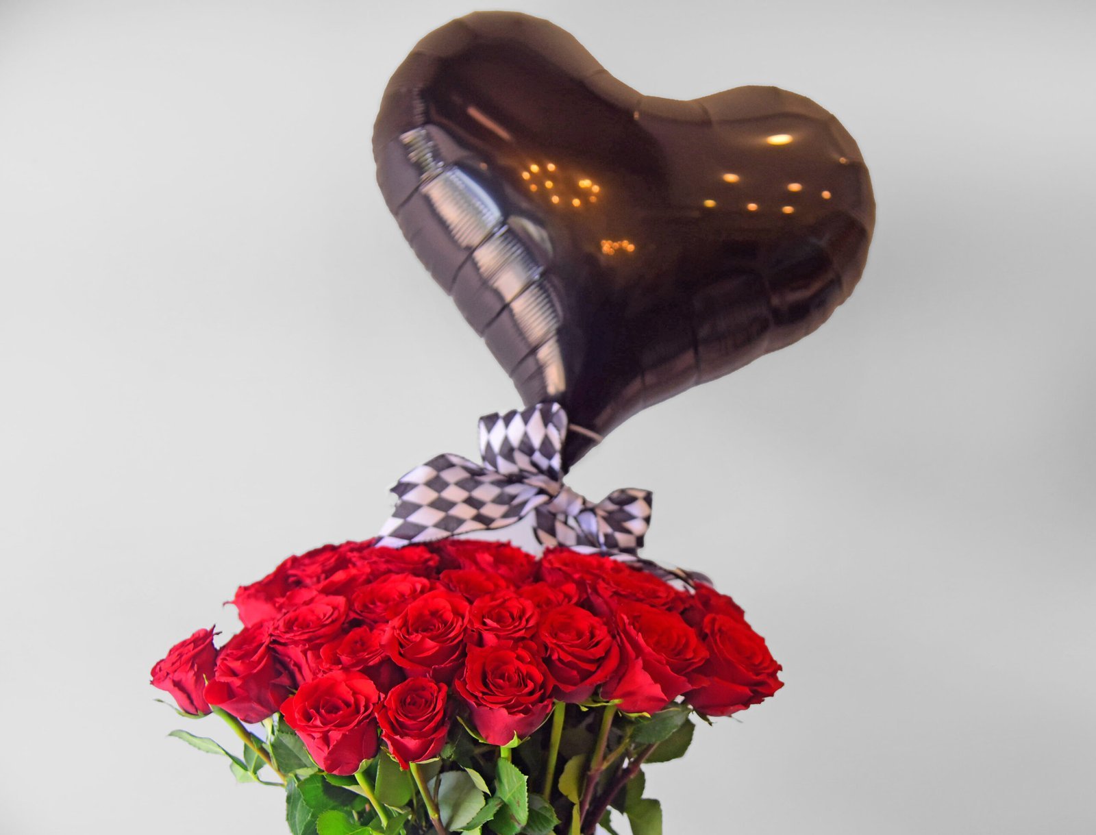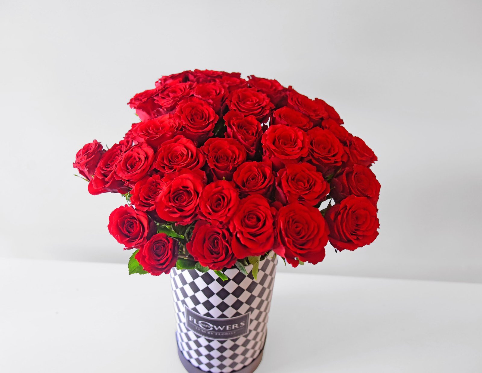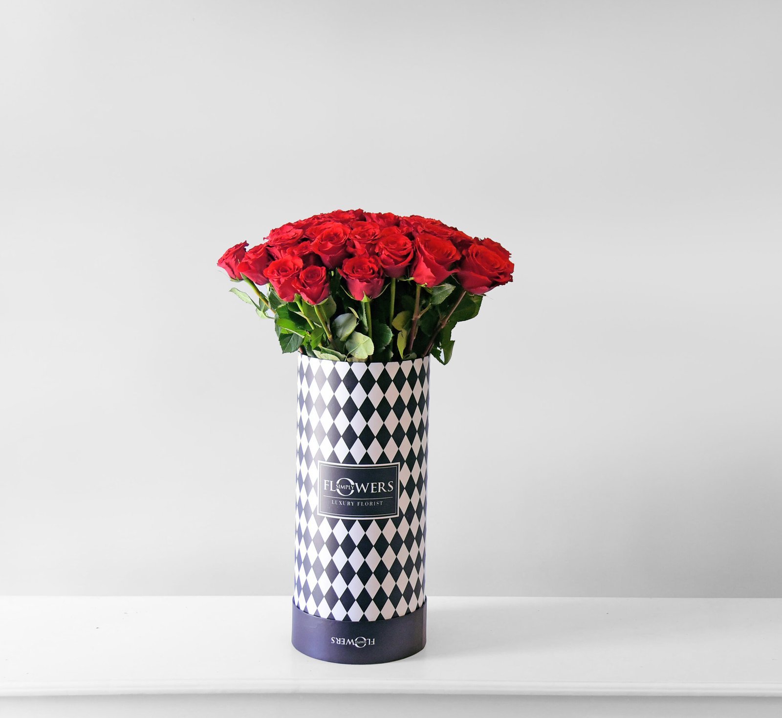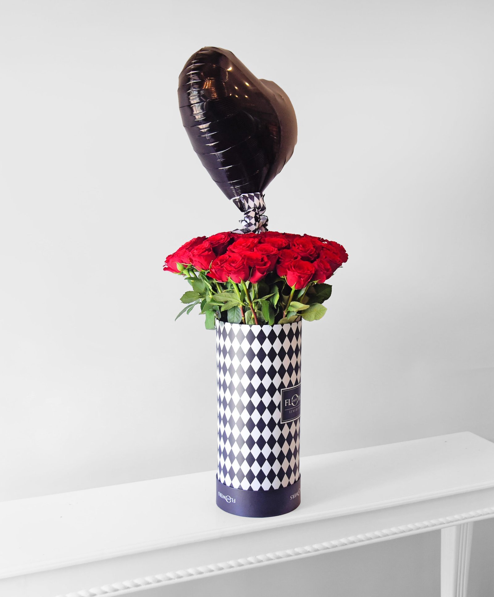 40 red roses in in our signature black logo diamante design hat box with a complimentary balloon.