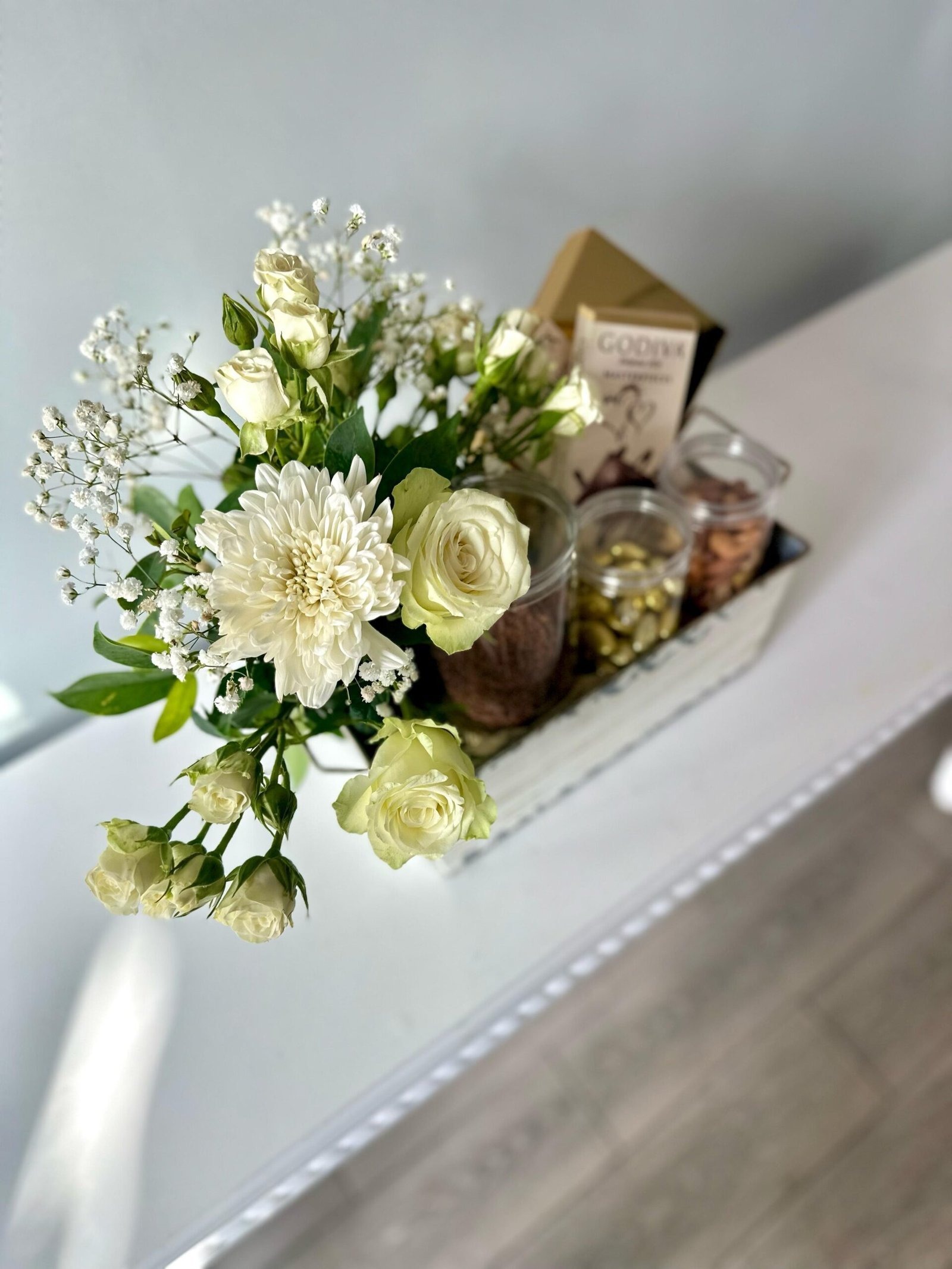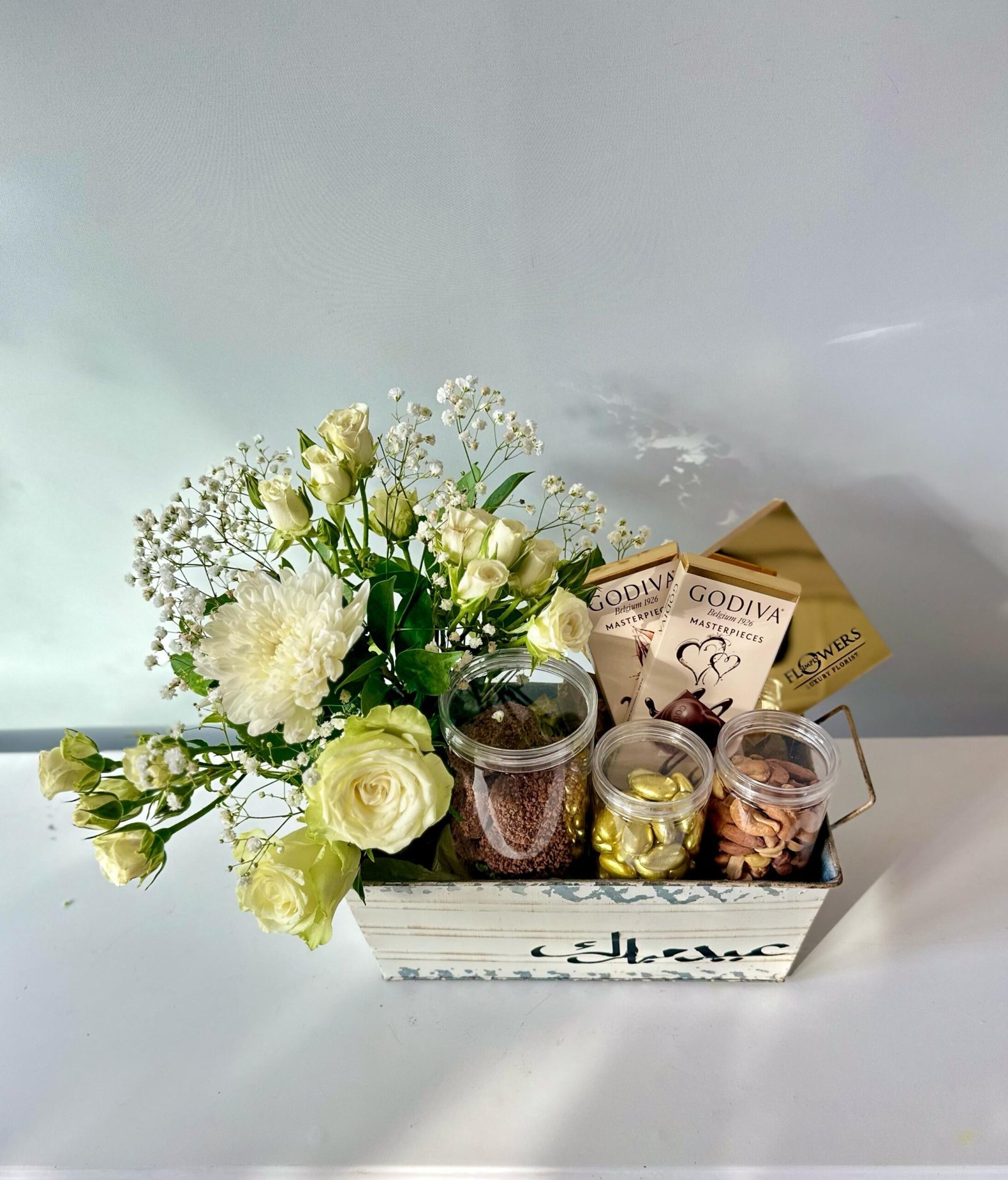 Celebrate Eid with our beautifully curated Eid hamper, filled with premium treats and decorated with luxury flowers.