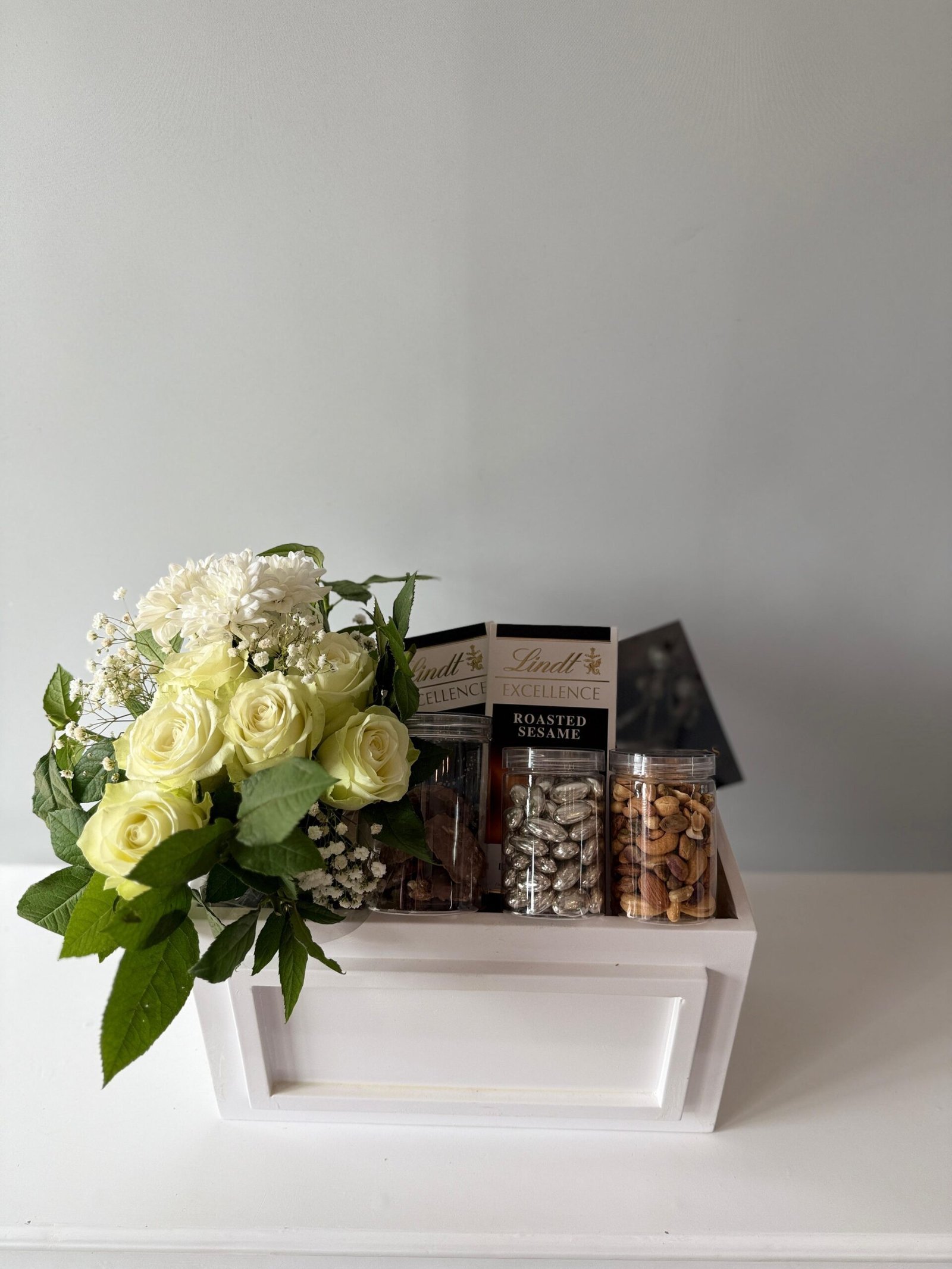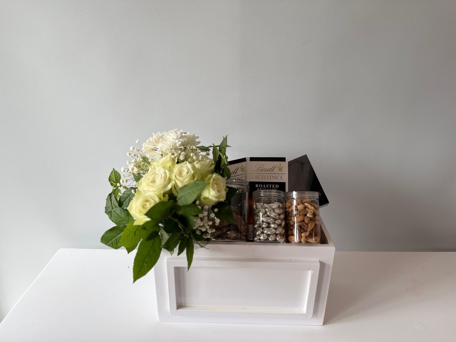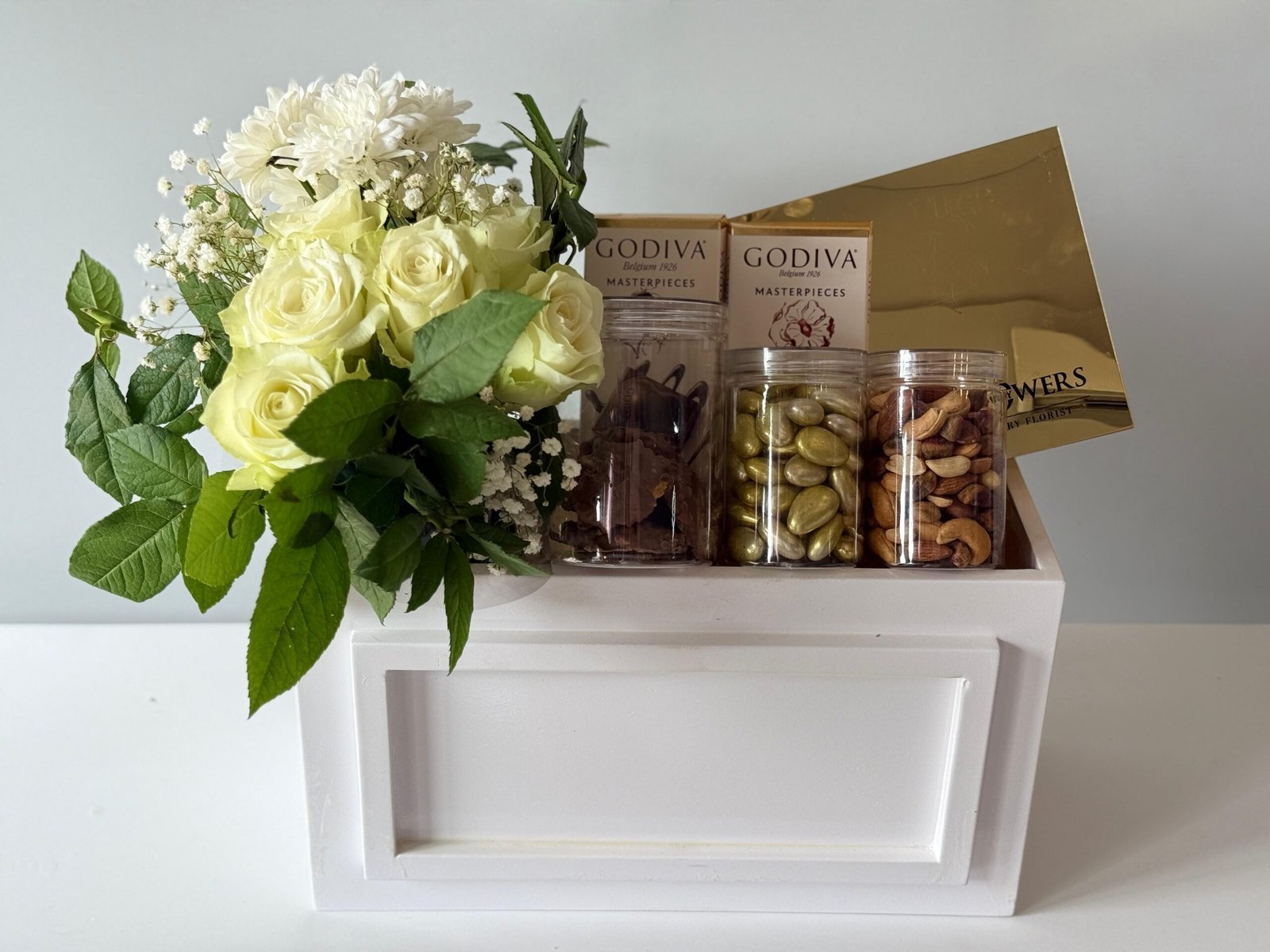 A delightful gift hamper featuring premium nuts, luscious dates, rich chocolate cookies, and sugar-coated almonds — beautifully paired with fresh flowers for the perfect touch of sweetness and charm.
