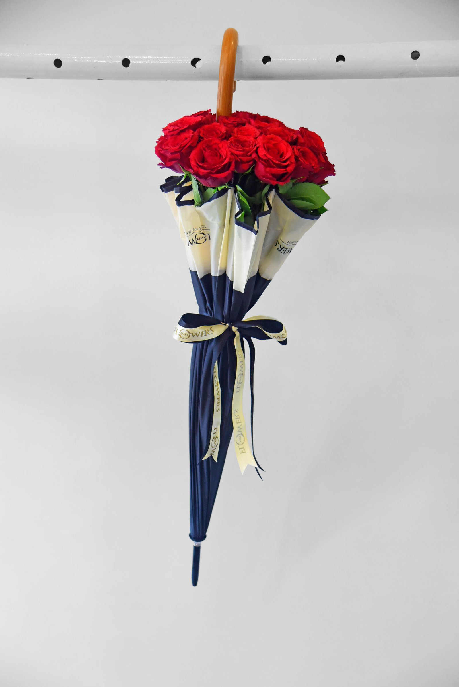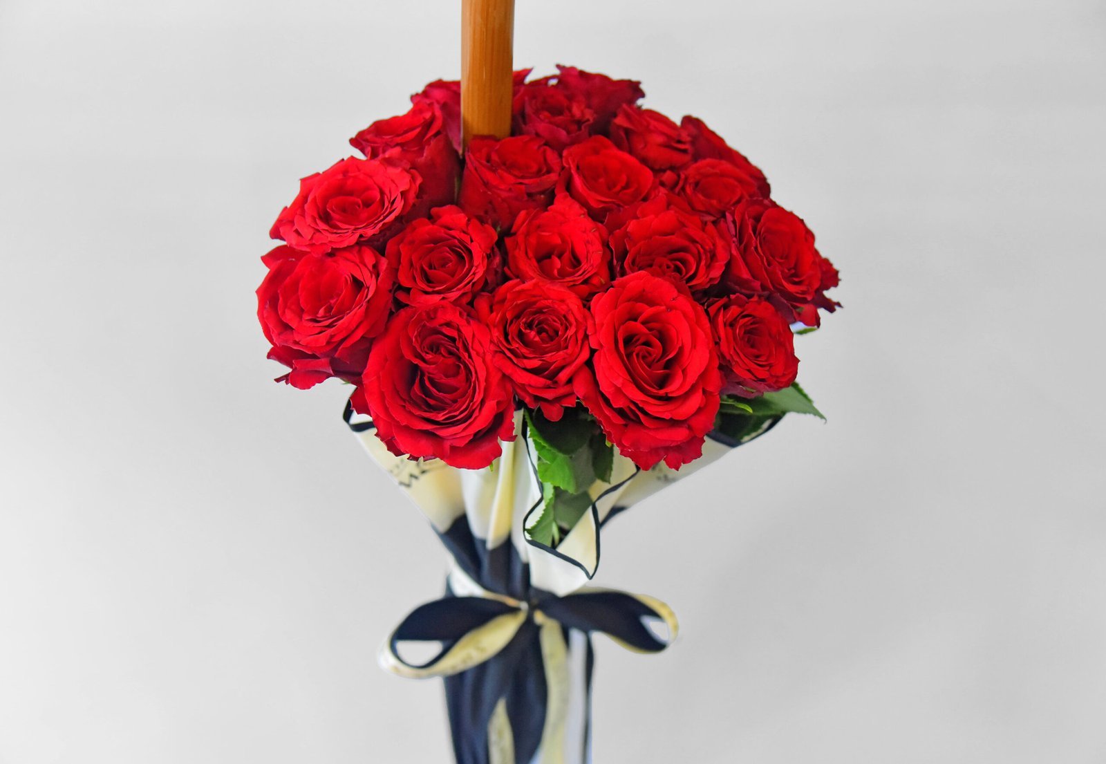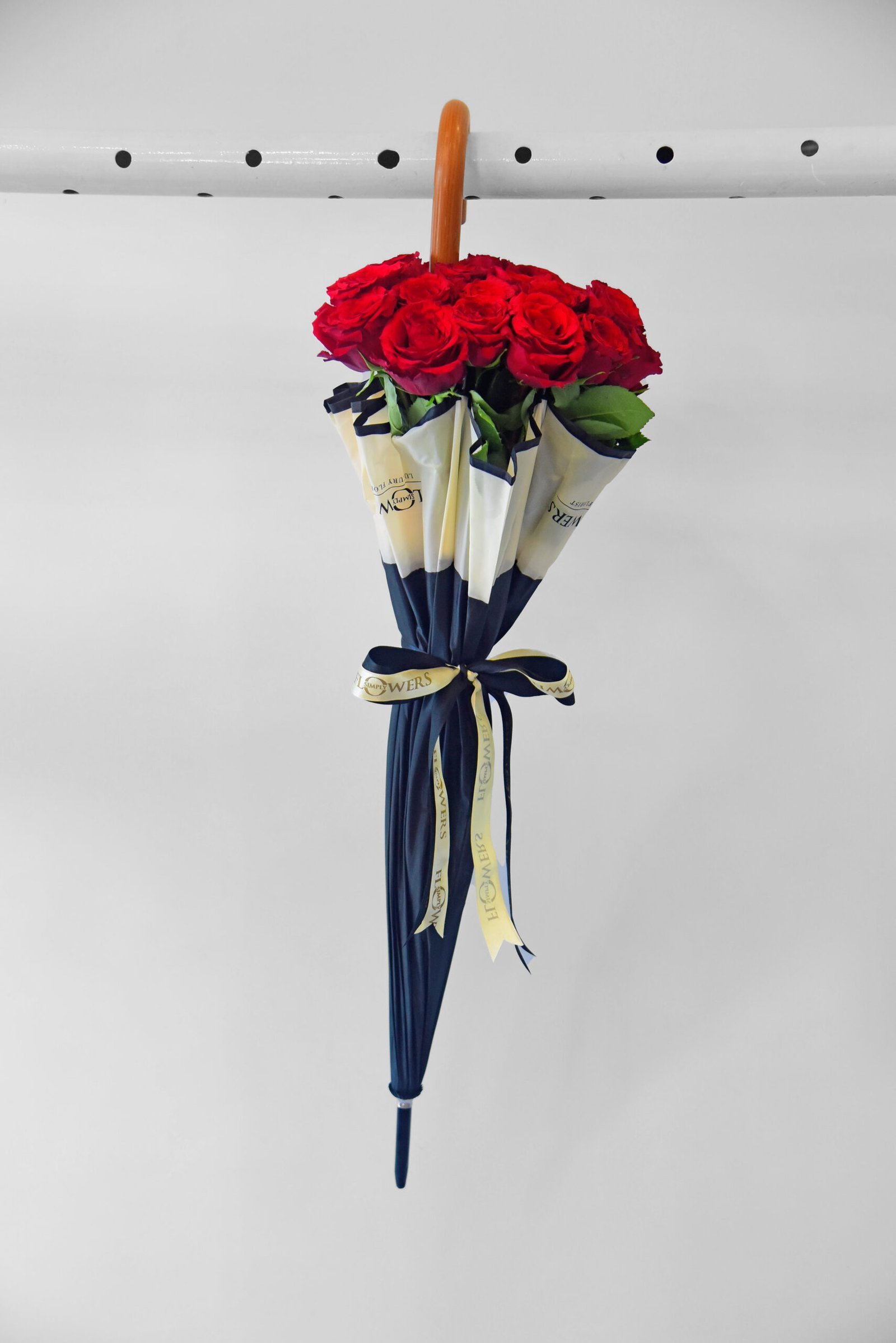 Plain black ribbon large with off-white/cream simply flowers ribbon with gold logo on top.