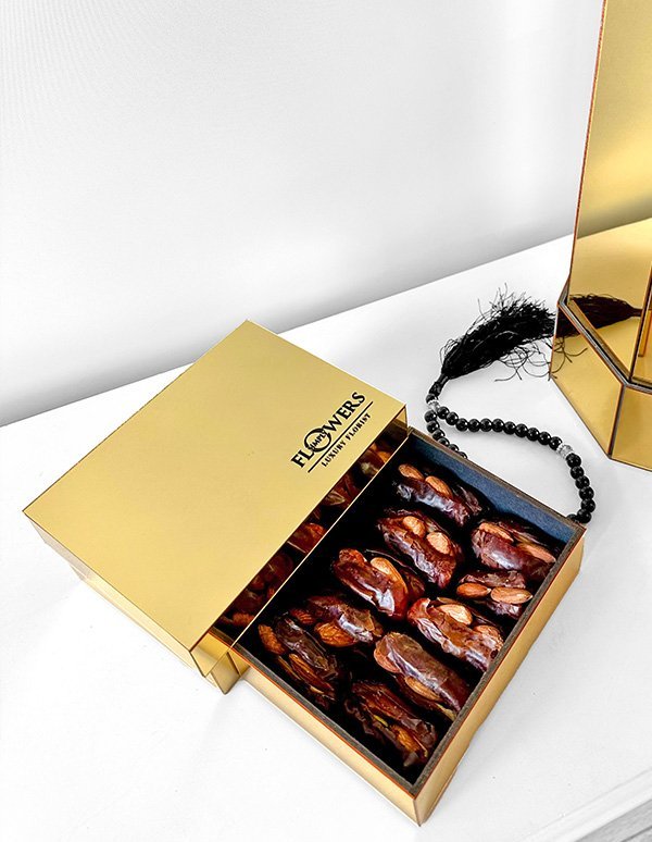 White roses in our luxury acrylic box with a luxury prayer mat, prayer beads and almond stuffed luxury dates