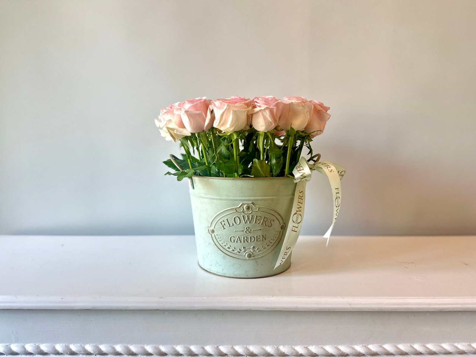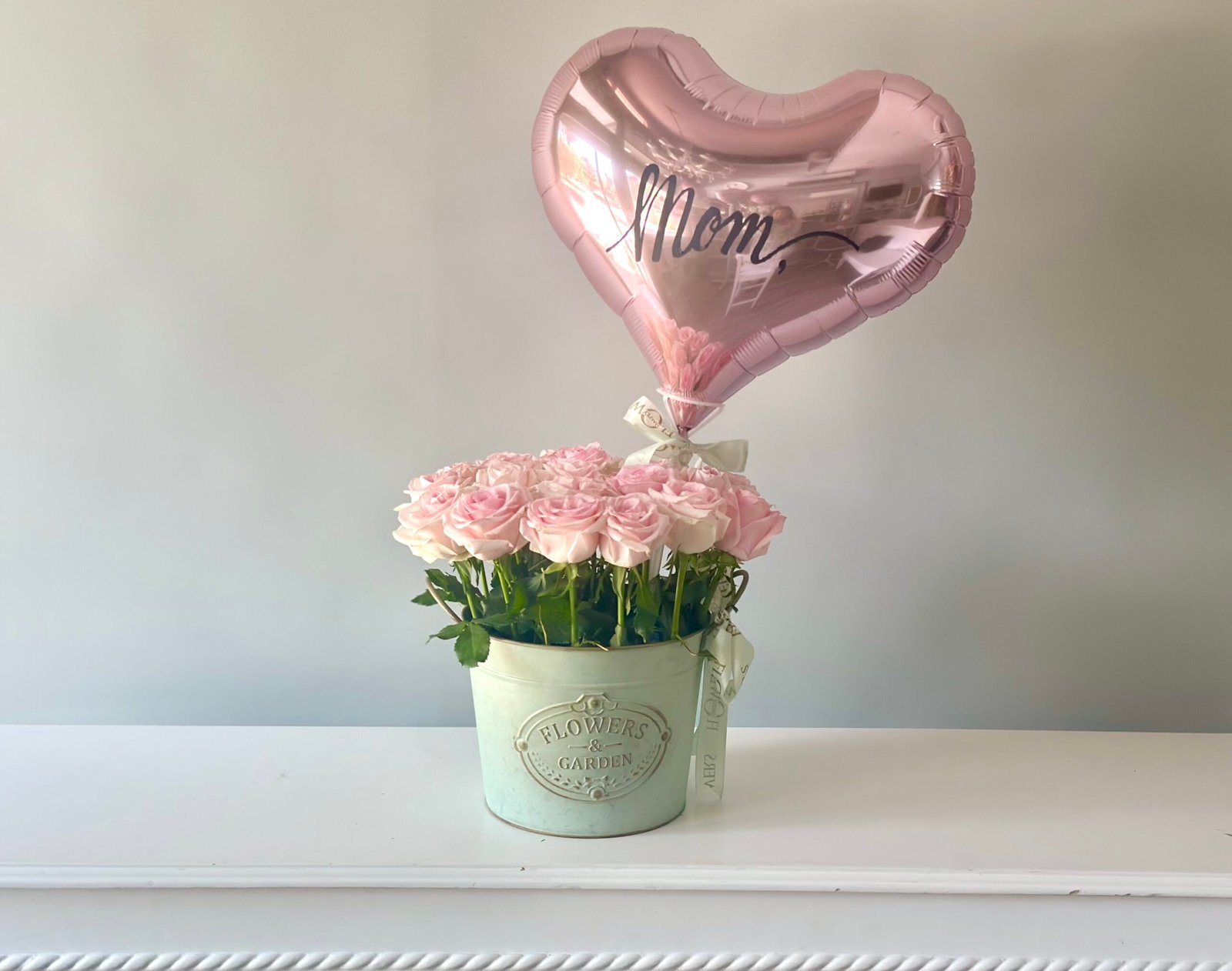 Soft, sweet, and elegantly simple—this charming arrangement in a rustic green pail is filled with garden-inspired rose arrangement blooms and paired with a rose gold heart-shaped balloon. A perfect pick for the mom who brings rosy love into every moment.